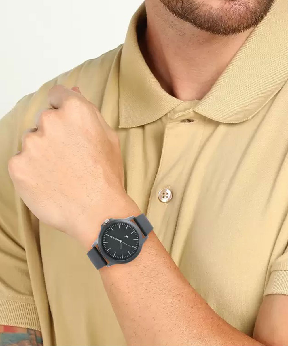 Take your fashion a notch higher with this black dial Tees Analog watch from The Minimalist by Fastrack Tees. Featuring a high durability silicone strap and a stainless steel back cover, the hands of this watch shows quartz movement. It is upto 3ATM water resistant.